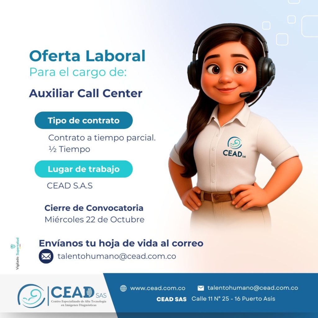 El Centro Especializado de Alta Tecnología en Imágenes Diagnósticas – CEAD SAS de Puerto Asís Putumayo, encargados de la prestación de servicios de imágenes diagnósticas, Busca Auxiliar Call Center Se parte de nuestro equipo de trabajo.