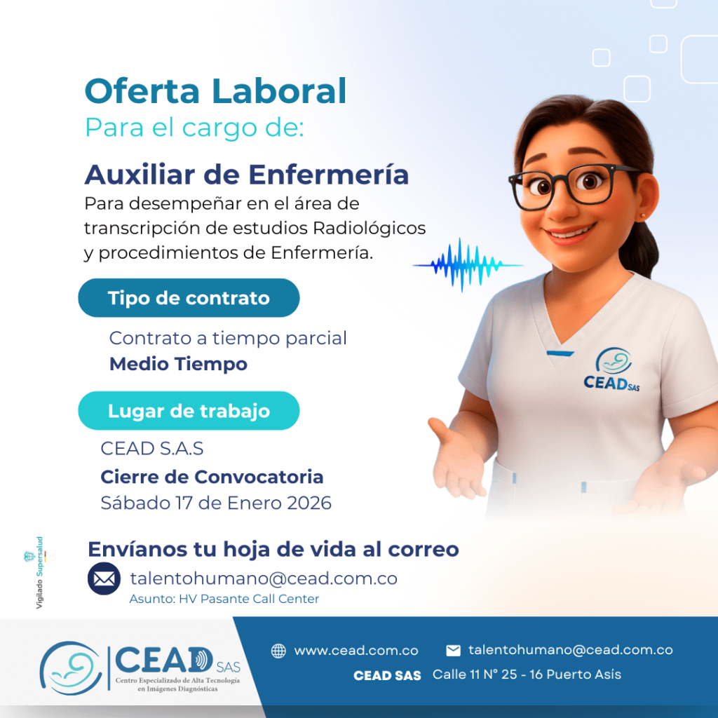 El Centro Especializado de Alta Tecnología en Imágenes Diagnósticas – CEAD S.A.S de Puerto Asís Putumayo, encargados de la prestación de servicios de imágenes diagnósticas, Busca Auxiliar de enefermería Se parte de nuestro equipo de trabajo.