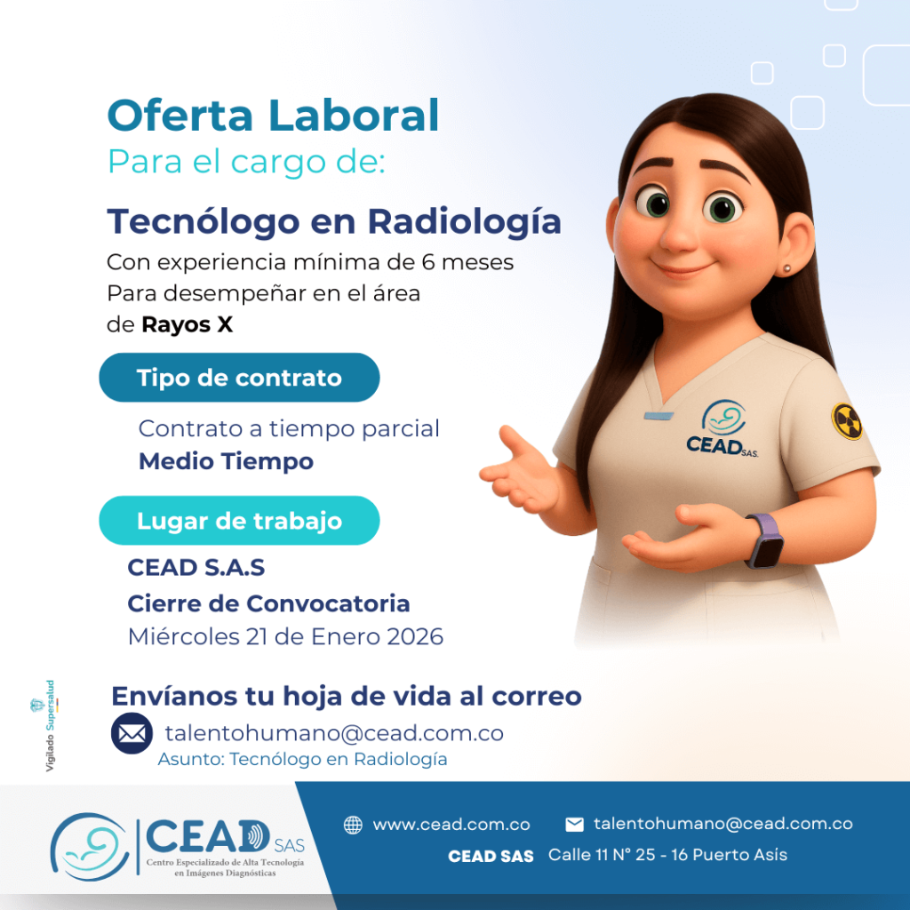 El Centro Especializado de Alta Tecnología en Imágenes Diagnósticas – CEAD S.A.S de Puerto Asís Putumayo, encargados de la prestación de servicios de imágenes diagnósticas, Busca Tecnólogo en Radiología, Se parte de nuestro equipo de trabajo.